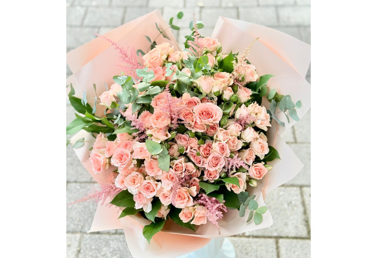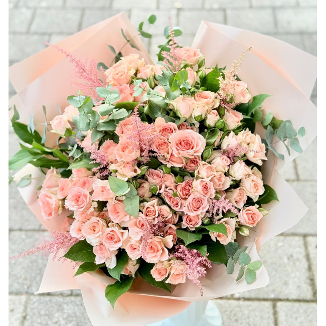 Buchet 21 miniroze Sweet Sarah, astilbe si eucalipt