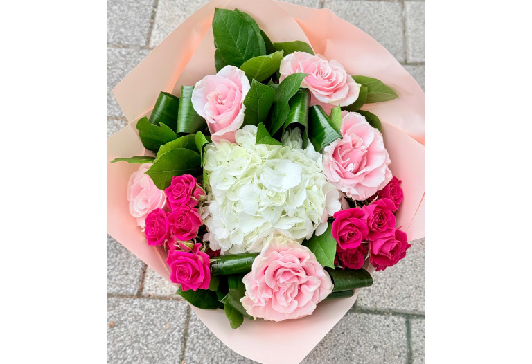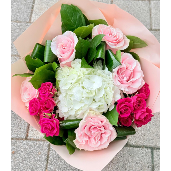 Buchet flori mixt. Compozitie: trandafiri, hortensia miniroze.
