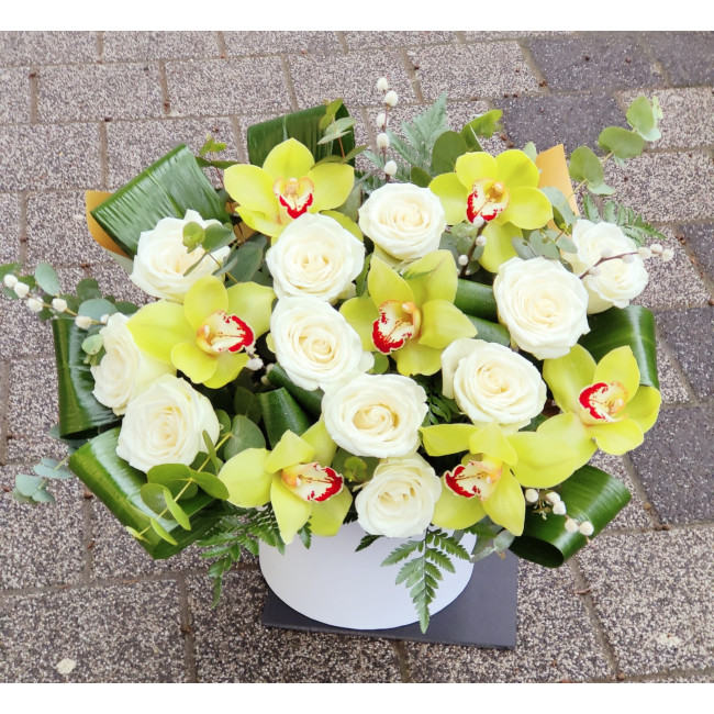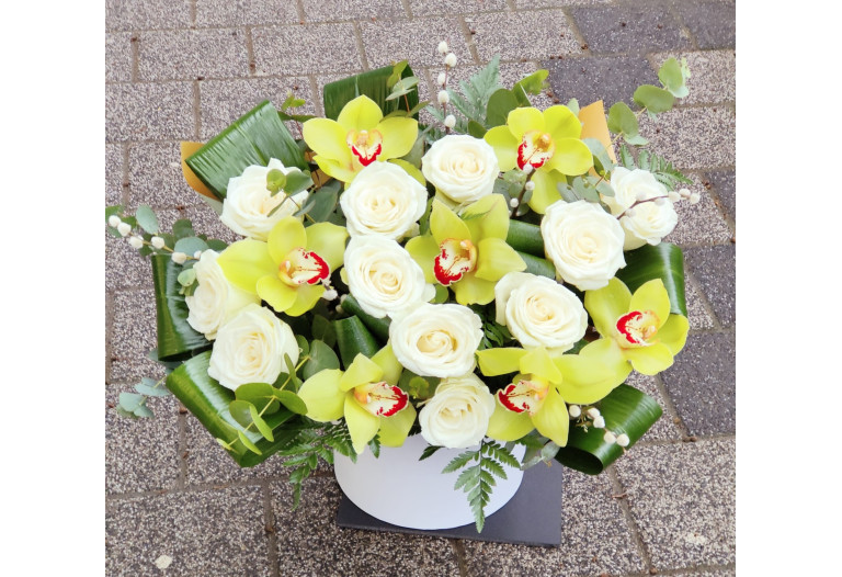 Aranjament floral deosebit realizat din orhidee cymbidium verde si trandafiri albi.