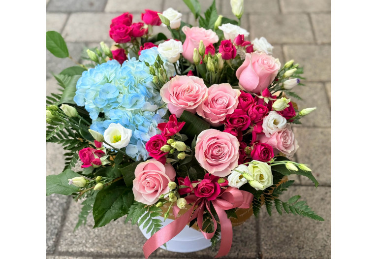 Aranjament floral mixt. Compozitie: hortensia, trandafiri, miniroze, lisianthus