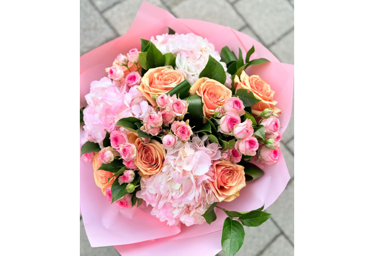 Buchet pastel :3 hortensia roz, 7 trandafiri 'Desert Rose', 5 miniroze roz