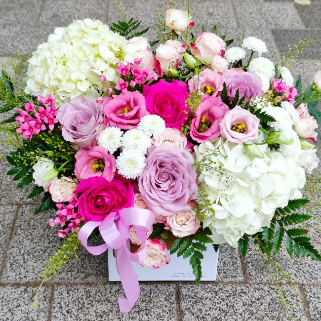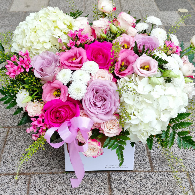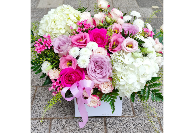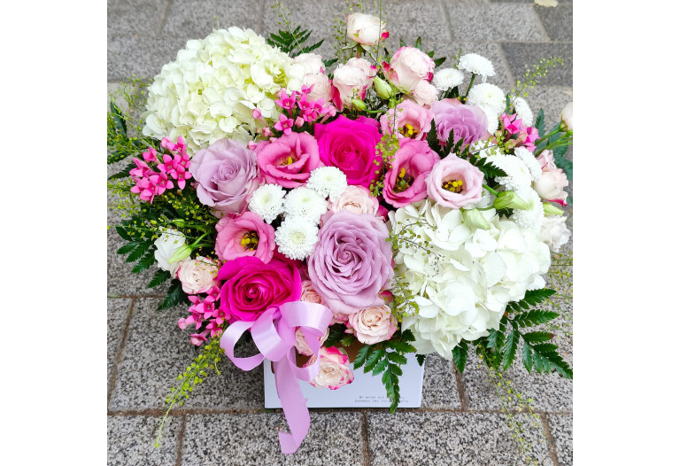 Aranjament floral mixt. Compozitie: hortensia, trandafiri, lisianthus, bouvardia, miniroze.