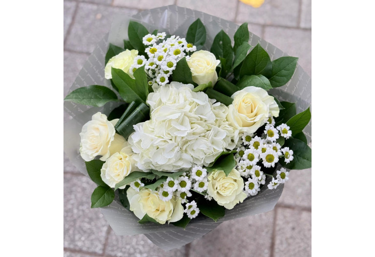 Buchet flori alb din hortensie, trandafiri si santini. Compozitie 1 hortensia, 7 trandafiri, 2 santini