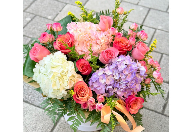 Aranjament floral mixt. Compozitie: hortensia, trandafiri, miniroze, solidagor