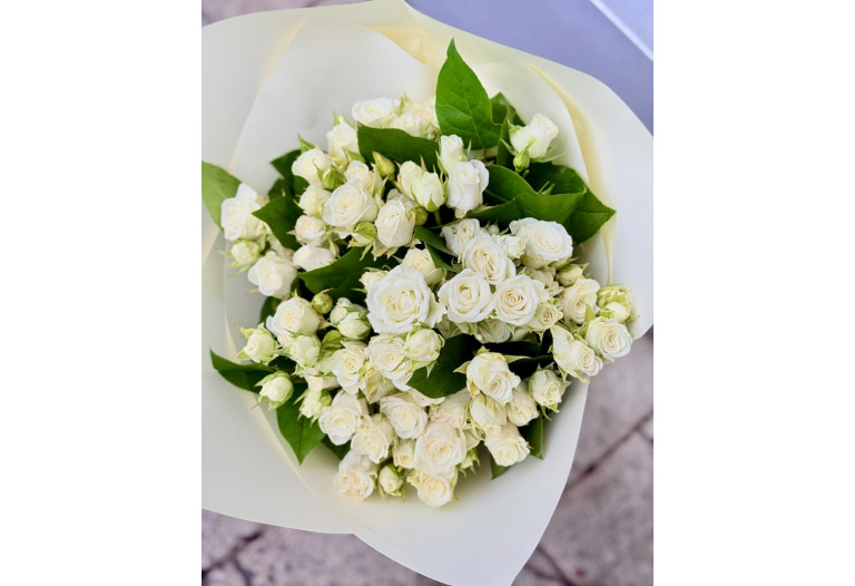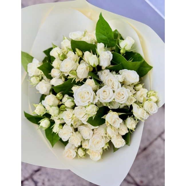 Buchet 9 miniroze albe frunze de salal