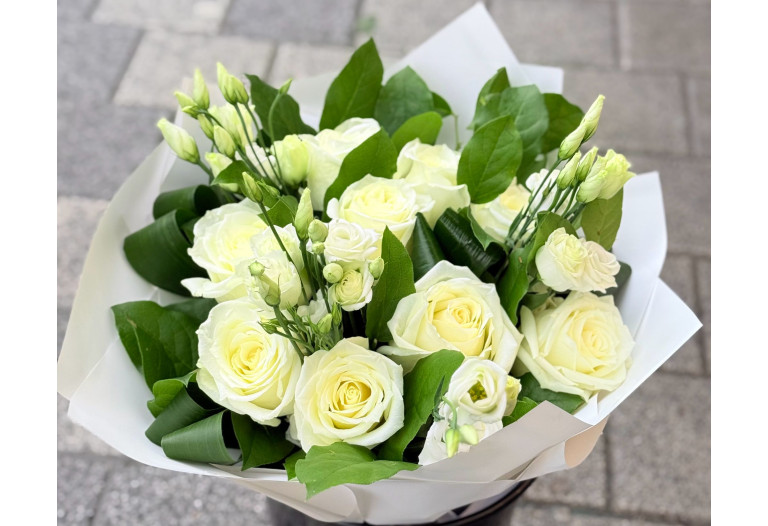 Buchet 9 trandafiri albi , 4 lisianthus alb