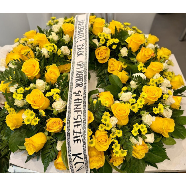 Coroana trandafiri galbeni eleganta potrivit pentru a aduce un omagiu celor dragi.