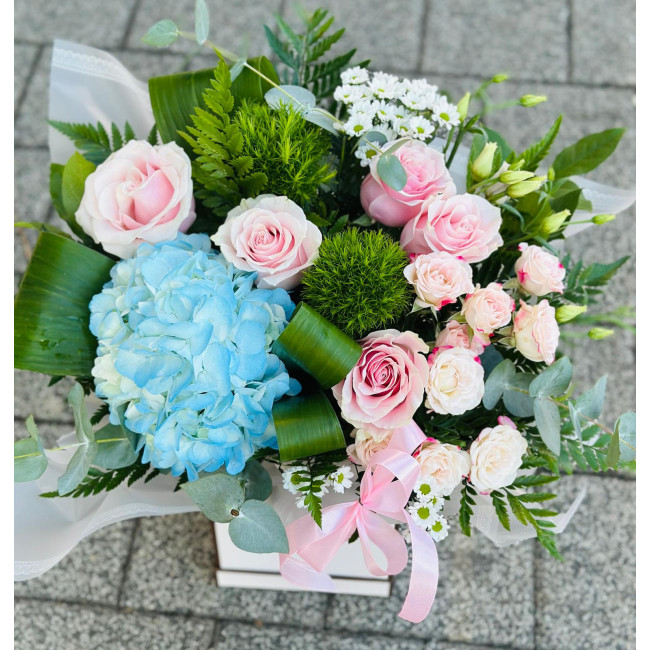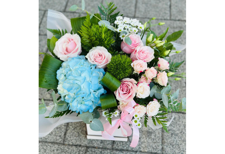 Aranjament floral. Compozitie: hortensia bleo, trandafiri roz pal, miniroze roz pal, dianthus