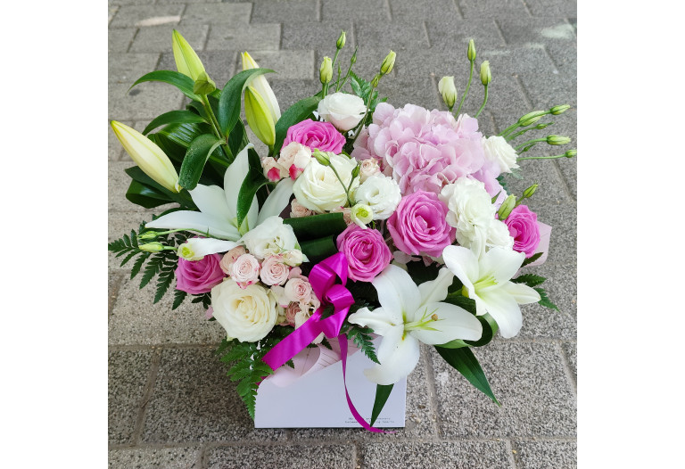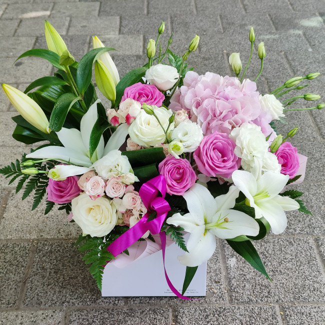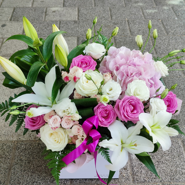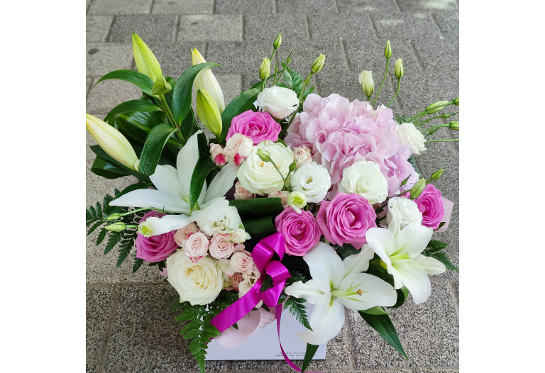 Aranjament floral mixt. Compozitie: 1 hortensia roz, 9 trandafiri roz si albi, miniroze roz pal 3 fire, crini 3 fire, lisianthus alb 3 fire.