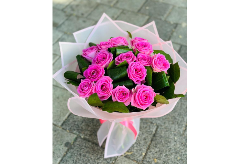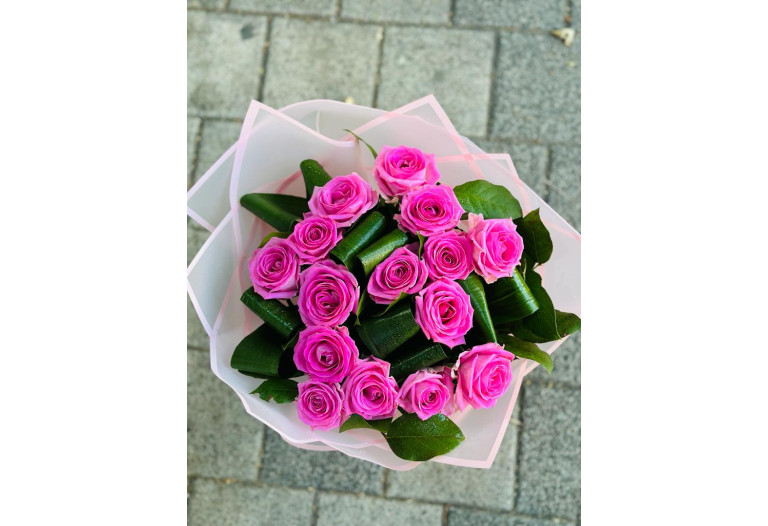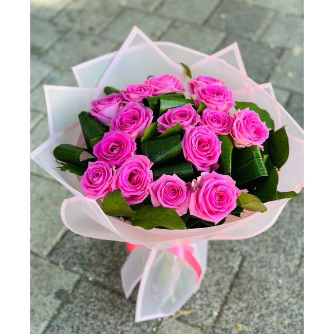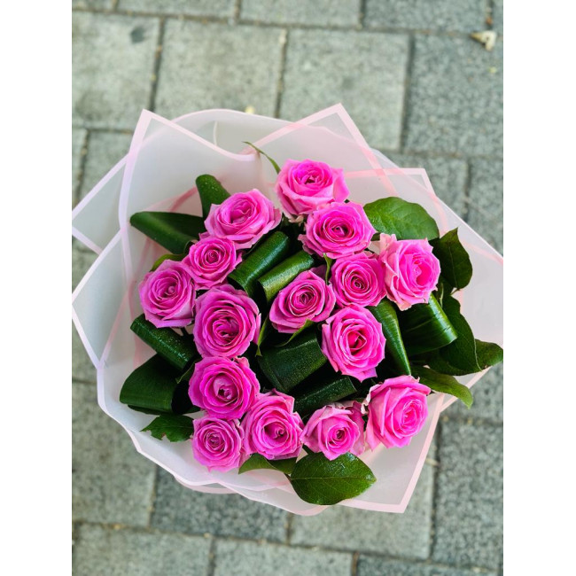Buchet 15 trandafiri roz Aqua, salal, aspidistra