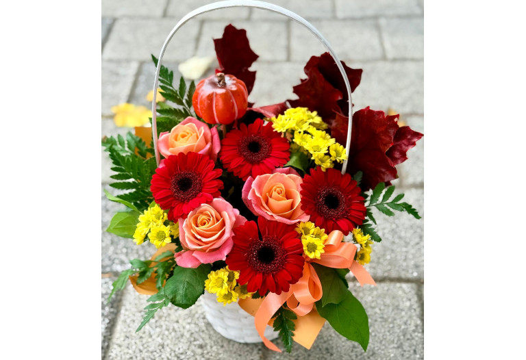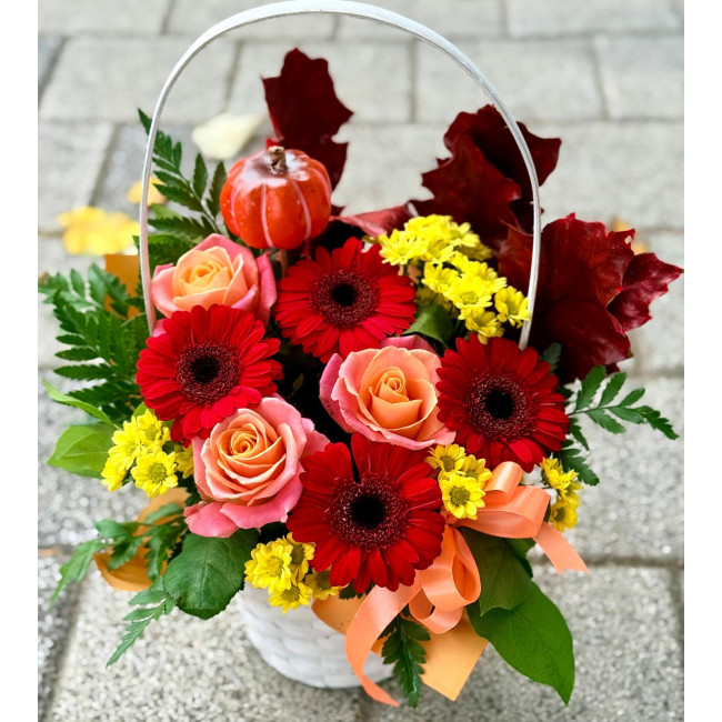 Aranjament cos flori de toamna. Compozitie : trandafiri, germini, santini,