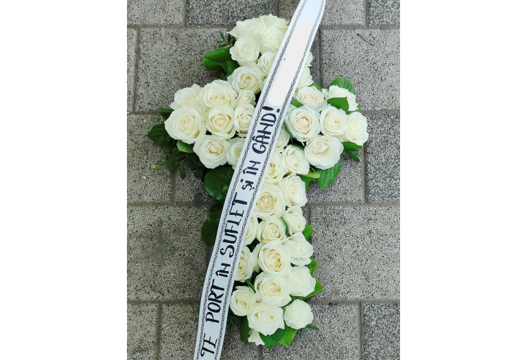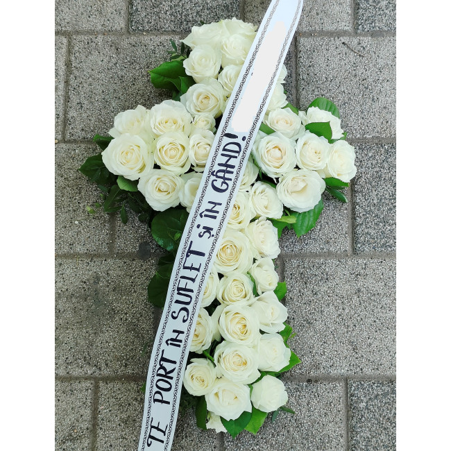 Aranjament funerar elegant in forma de cruce, potrivit pentru a aduce un omagiu