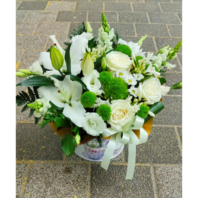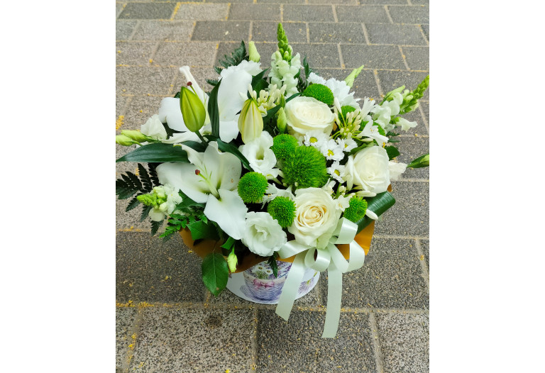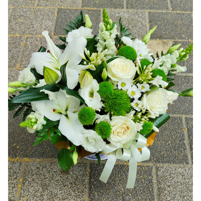 Aranjament floral mixt. Compozitie: crini, lisianthus, santini, dianthus.