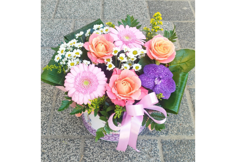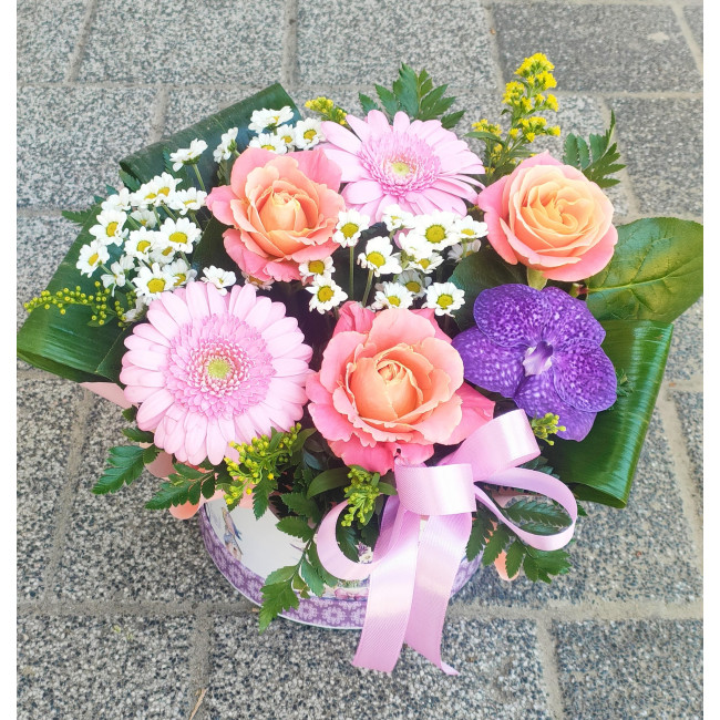Aranjament colorat potrivit pentru orice ocazie. Compozitie: trandafiri, germini, lisianthus, santini, alstroemeria.