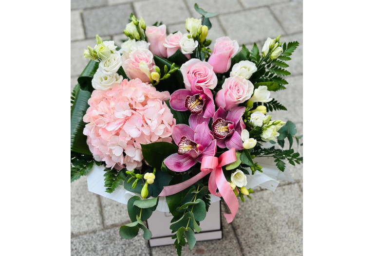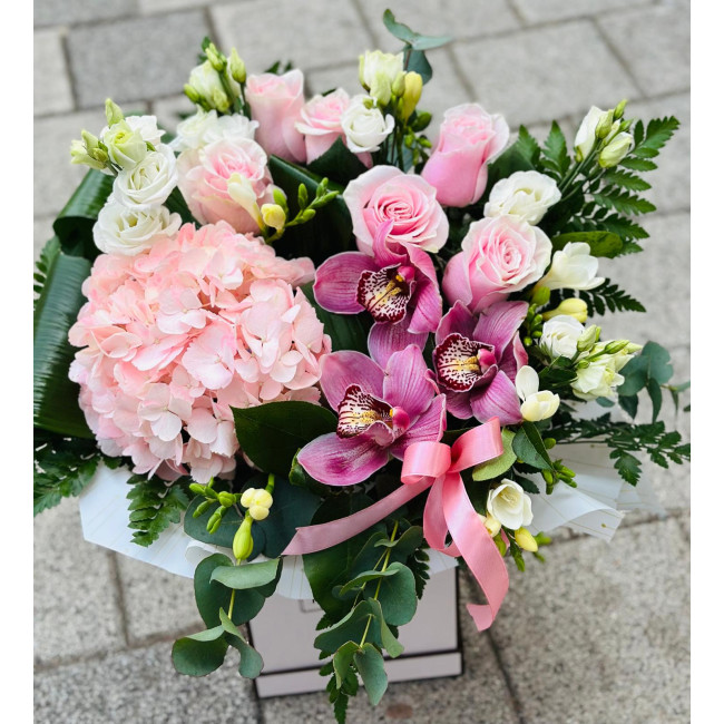 Aranjament floral mixt. Compozitie: hortensia, orhidee Cymbidium, trandafiri,