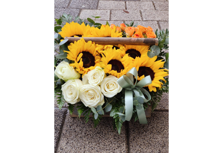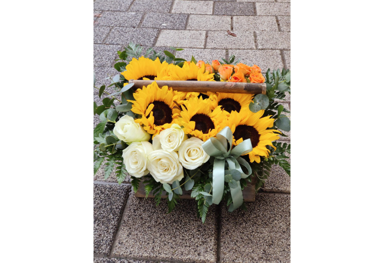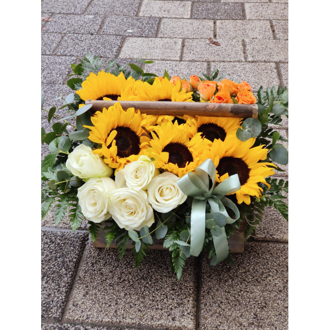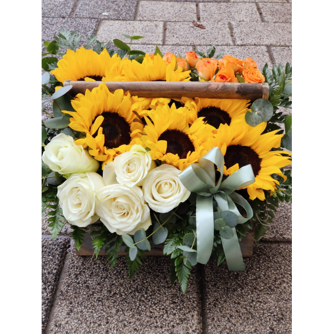 Aranjament floral de sezon floarea soarelui, trandafiri portocalii, trandafiri albi