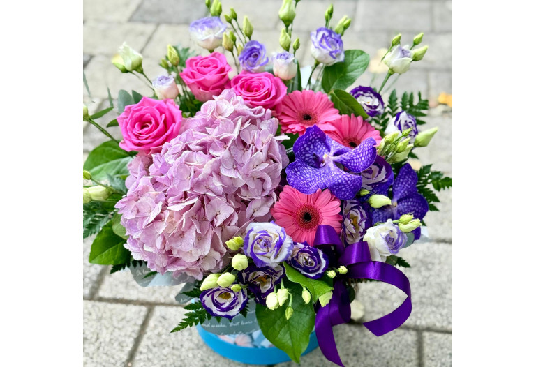 Aranjament floral mixt. Compozitie: orhidee Vanda, hortensia, lisianthus, trandafiri ,germini,