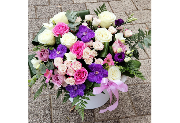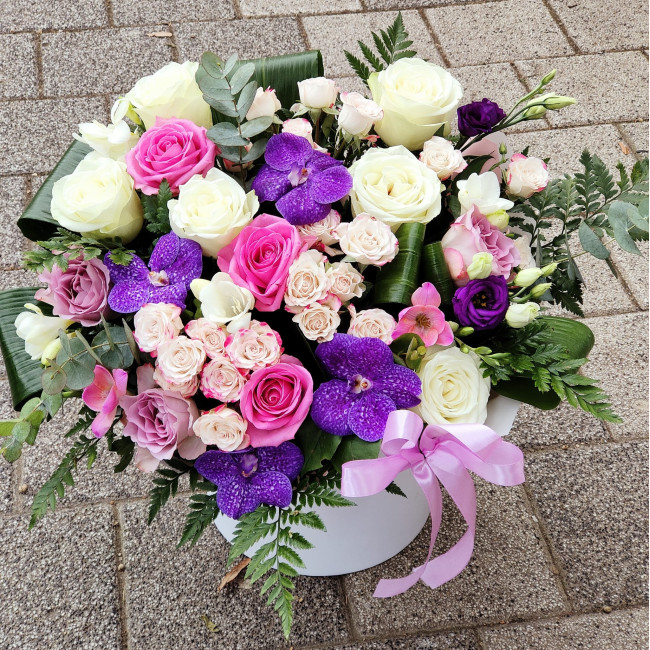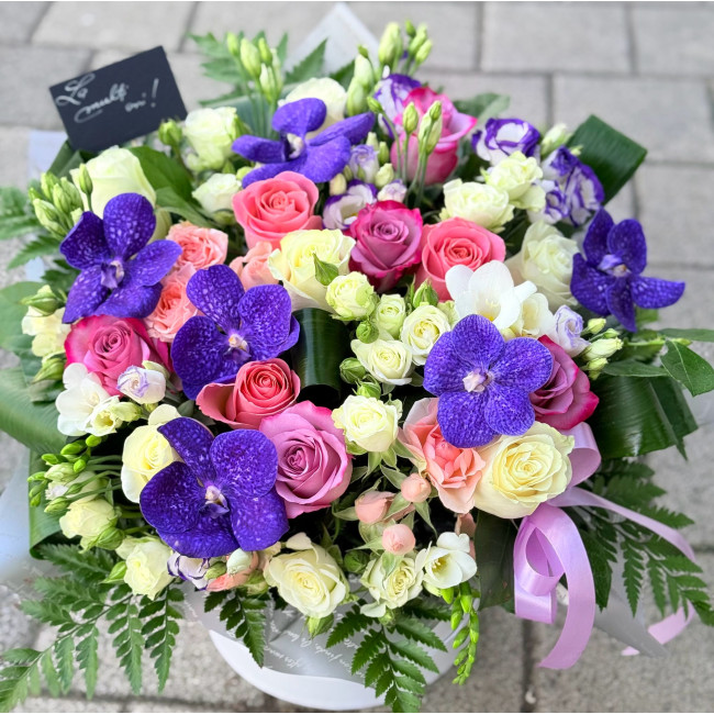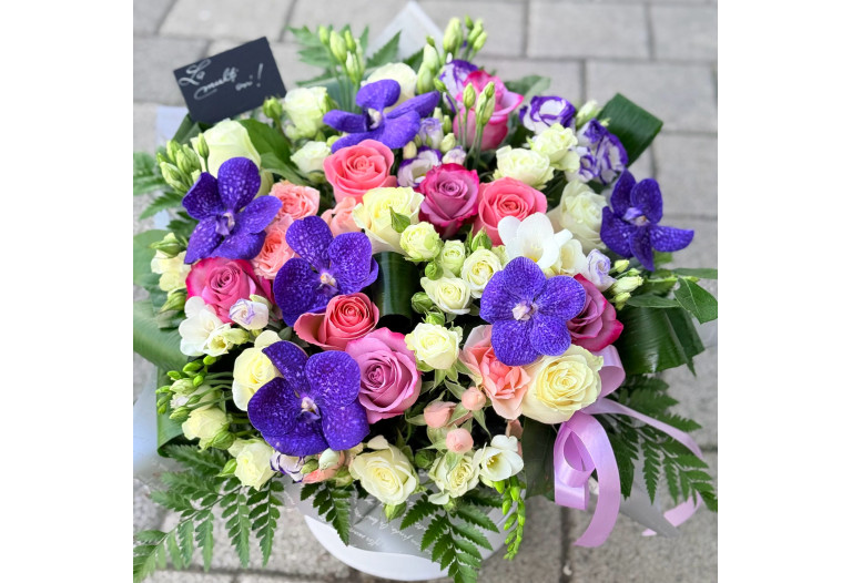 Aranjament floral mixt. Compozitie: trandafiri, miniroze, frezii si orhidee Vanda