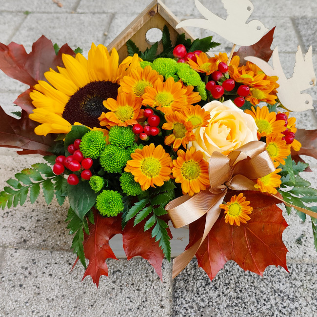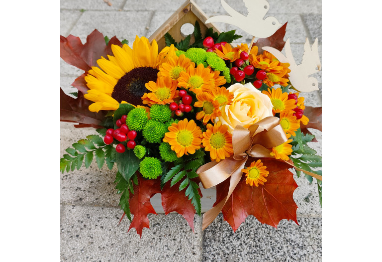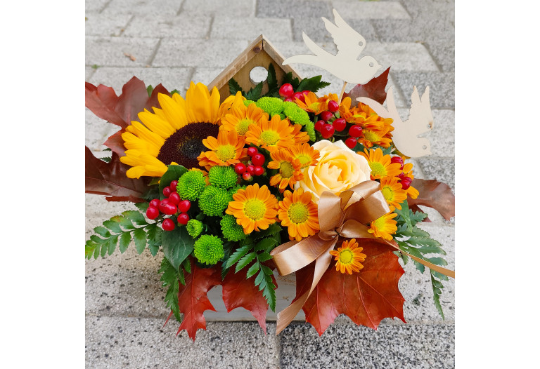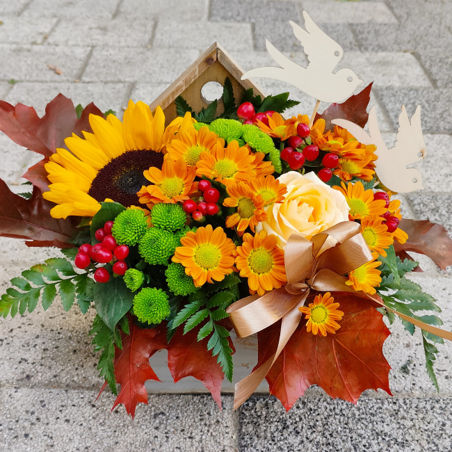 Florile folosite in realizarea aranjamentului sunt proaspete si de cea mai buna calitate, garantam mentinerea florilor cel putin 5 zile, in conditii de temperatura optima (minim 5 grade, maxim 23 grade) si completarea zilnic de 100 ml de apa.