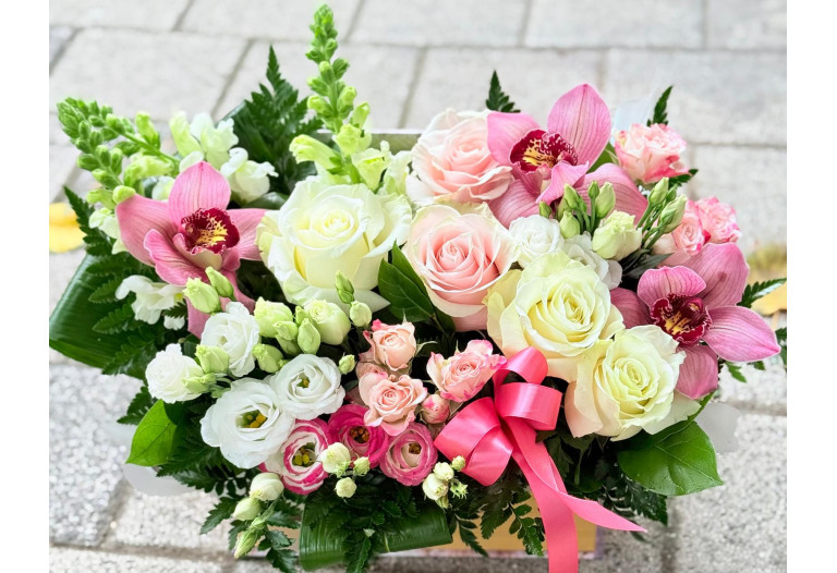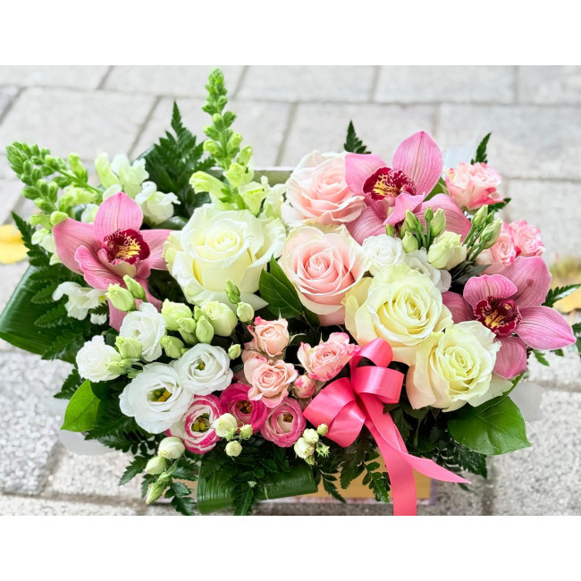 Aranjament floral deosebit in cutie carte, realizat din flori in culori alb roz pal. Compozitie: trandafiri, orhidee Cymbidium (produs disponibil in perioada octombrie - 15 iunie. In extra sezon va fi inlocuita cu o floare asemanatoare), miniroze, asltroemeria.