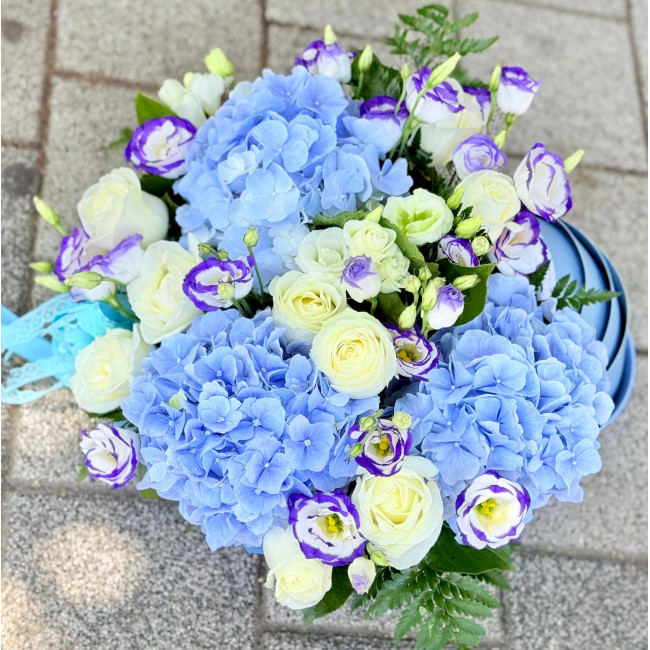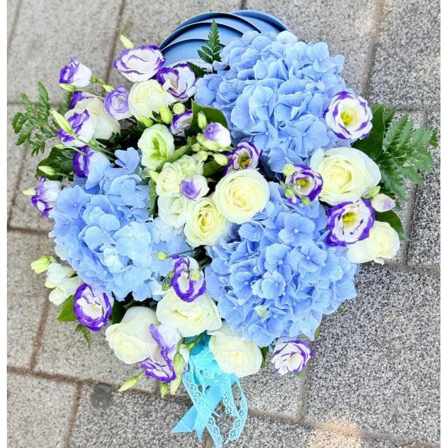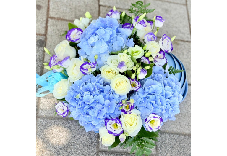 Aranjament flori mixt. Compozitie: trandafiri, dianthus, santini, gerbera, amaryllis (produs disponibil in perioada noiembrie - mai. In extrasezon va fi inlocuita cu o floare asemanatoare).