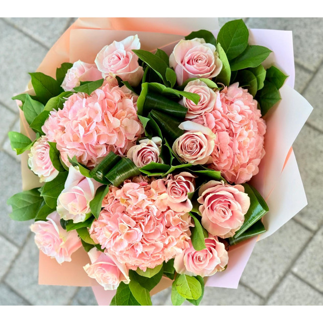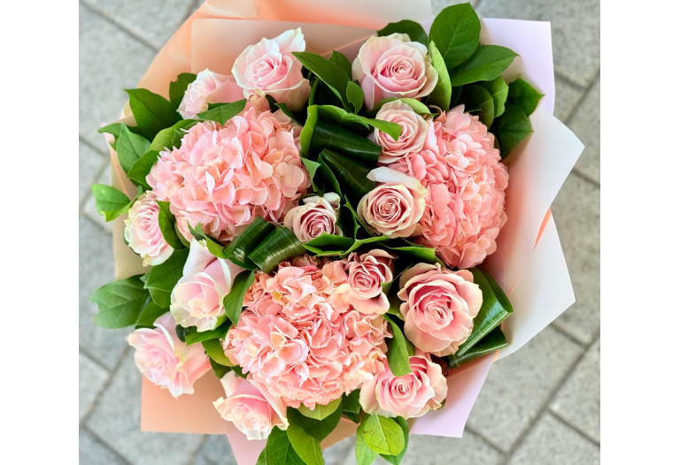 Buchet flori hortensia si trandafiri roz Compozitie 3 hortensii si 14 trandafiri Pink Mondial