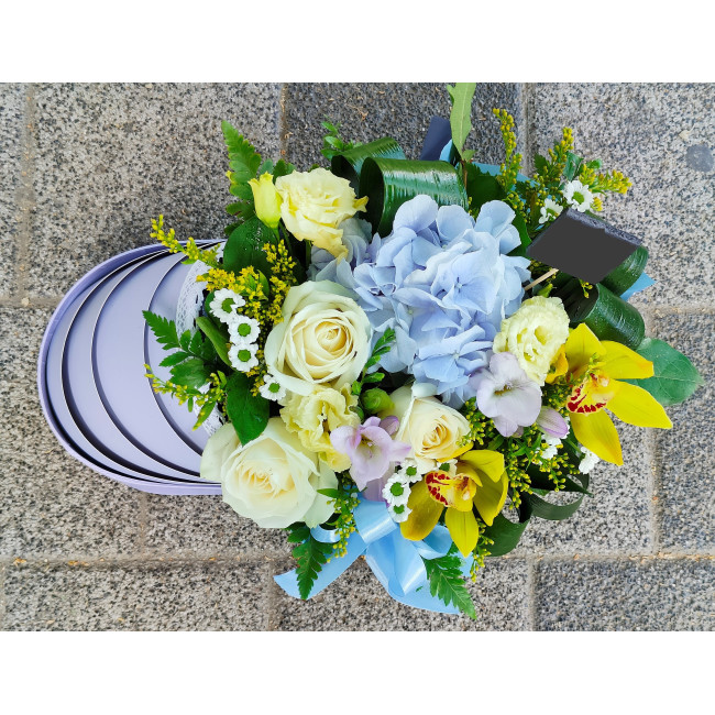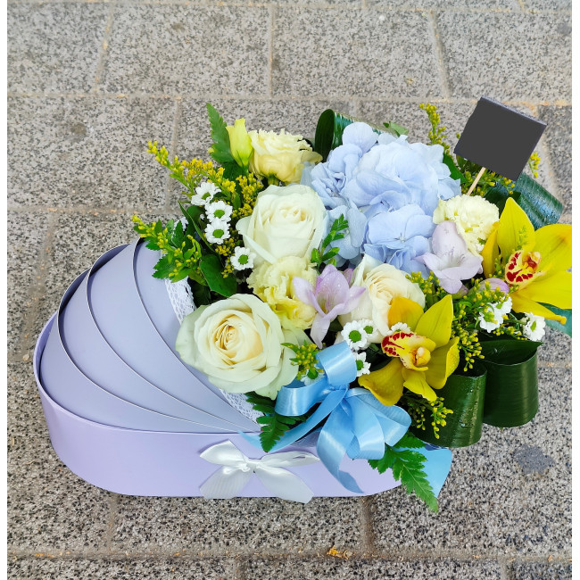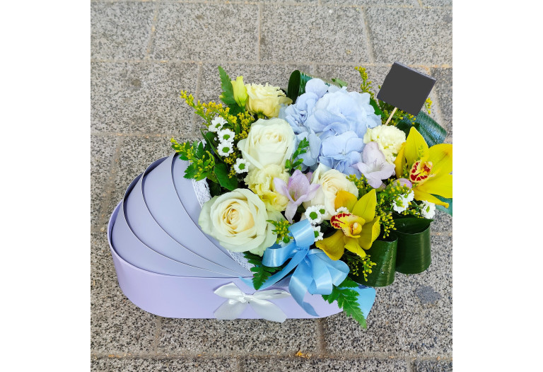 Aranjament floral in landou. Compozitie: hortensia, lisianthus, orhidee Cymbidium (produs disponibil in perioada octombrie - 15 iunie. In extra sezon va fi inlocuita cu o floare asemanatoare), trandafiri, frezii, santini, solidago.
