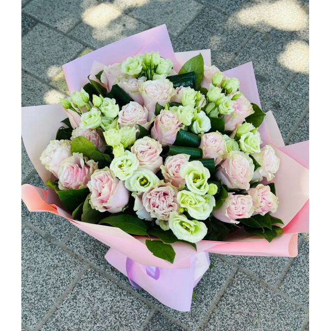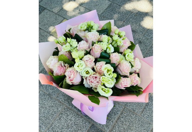 Buchet mixt. Compozitie: trandafiri si lisianthus
