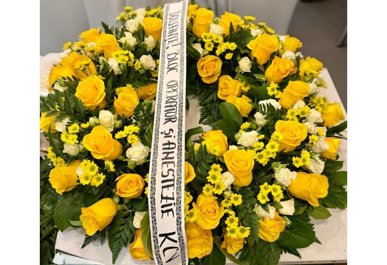 Coroana trandafiri galbeni eleganta potrivit pentru a aduce un omagiu celor dragi.