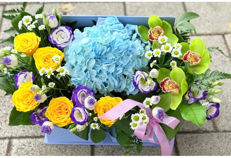 Aranjament flori mixt. Compozitie: hortensia, bujori (diponibila in perioada 15 aprilie - 15 iulie. In extra sezon va fi inlocuita cu o floare asemanatoare), trandafiri, lisianthus.
